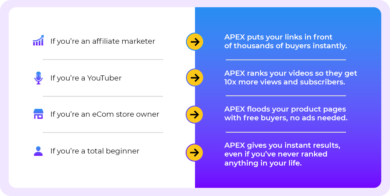 This all-in-one system automates the entire process of creating high-quality, optimized content and ranking it on Google in minutes instead of months. With just a single click, APEX AI handles keyword research, content writing, on-page optimization, and publishing—so you can focus on monetizing the results.
